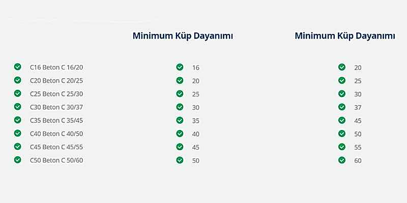 Hazır Beton sınıfları; C40 Beton, C35 Beton, C30 Beton, C25 Beton, Şap Beton, Brüt Beton, Dmax Beton, Katkısız Beton...